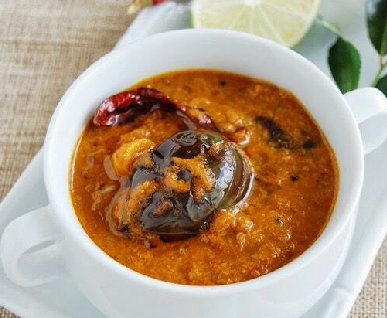 Hyderabadi eggplants in spiced sesame-tamarind gravy, rich, tangy, flavorful, ideal with rice.